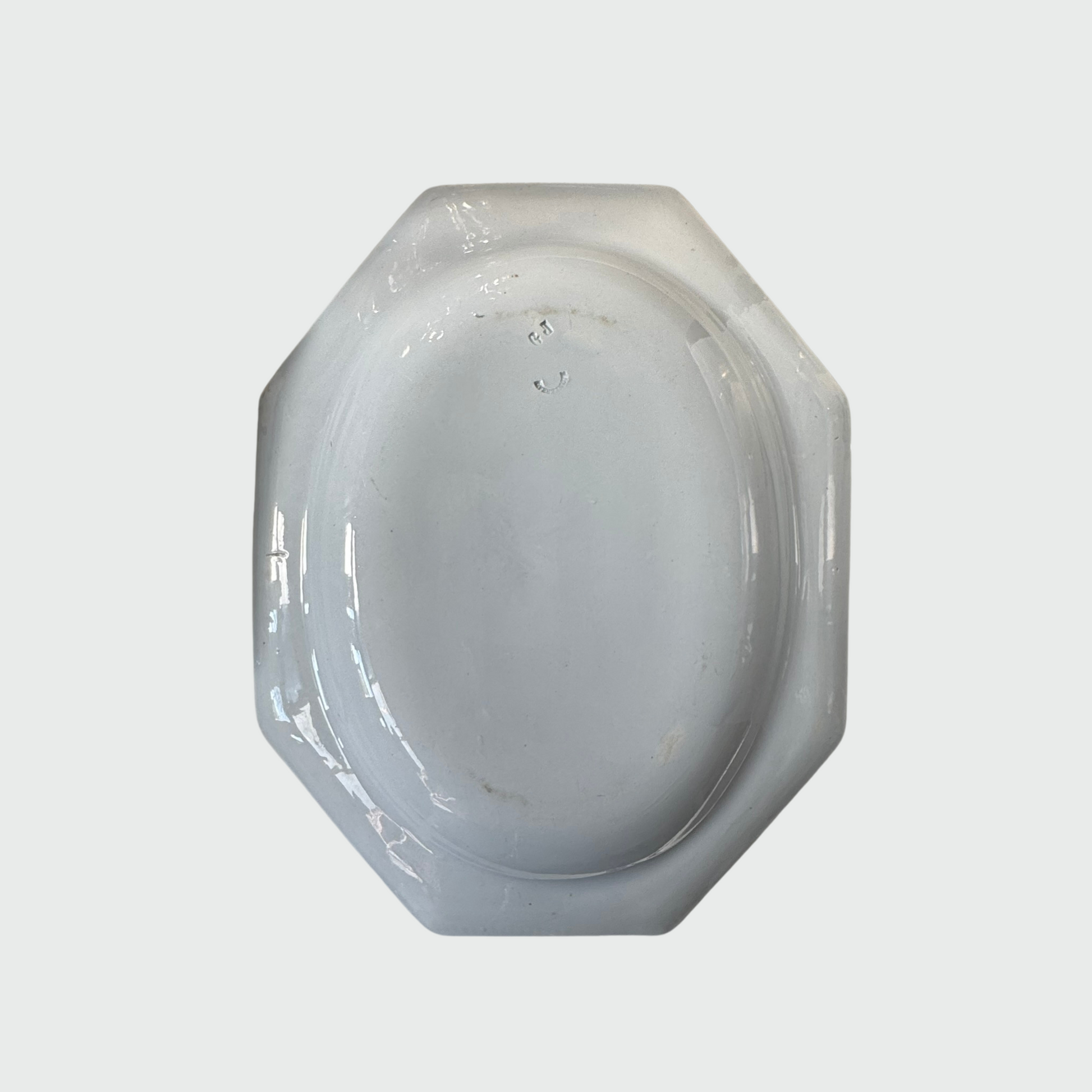 This exquisite antique French earthenware platter from Creil Montereau, dating to the early 19th century, features a large octagonal design with elegant pearl edging. Its delicate light blue hue adds a unique and timeless charm.