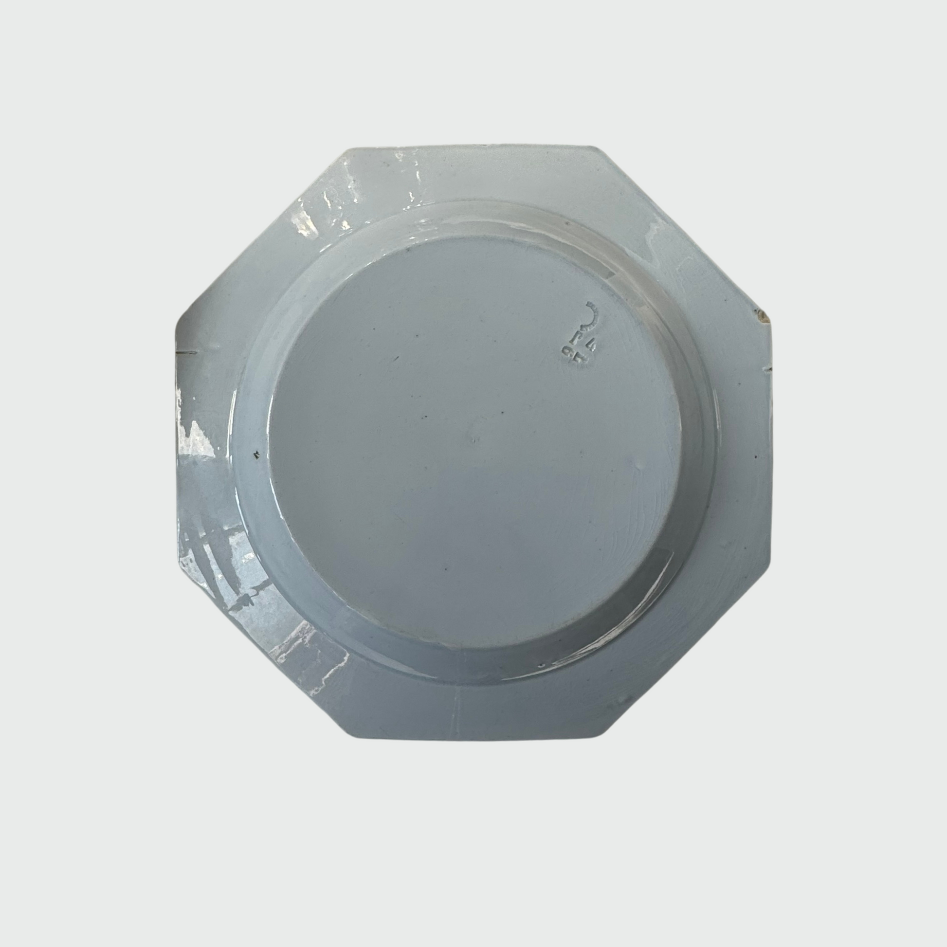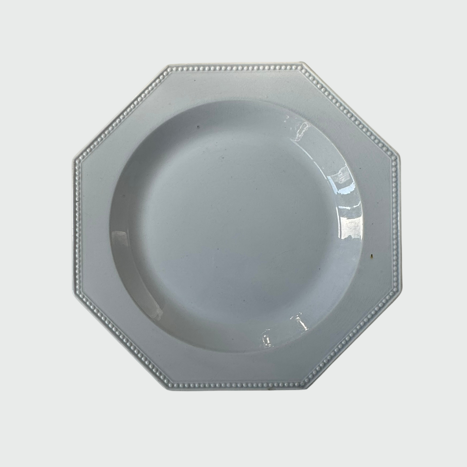 This exquisite antique French earthenware platter from Creil Montereau, dating to the early 19th century, features a large hexagonal design with elegant pearl edging. Its delicate light blue hue adds a unique and timeless charm.