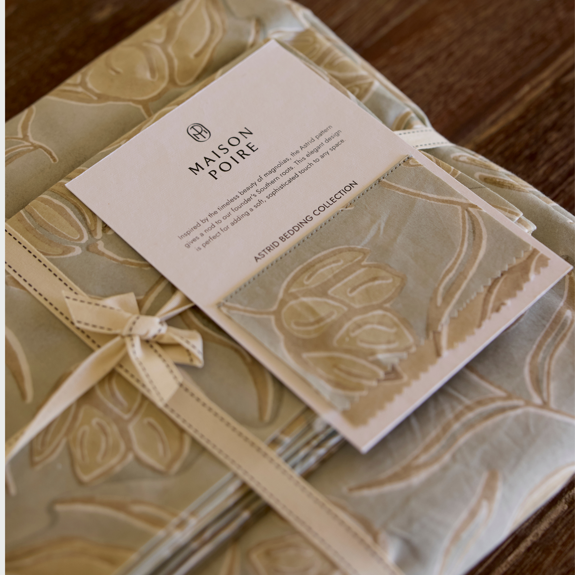 Inspirée de la beauté intemporelle des magnolias, la parure de lit Astrid rend hommage aux racines sudistes de notre fondatrice. Ce design élégant est parfait pour ajouter une touche douce et sophistiquée à n'importe quel espace. La housse de couette est imprimée à la main au bloc de bois sur notre percale de coton le plus doux.