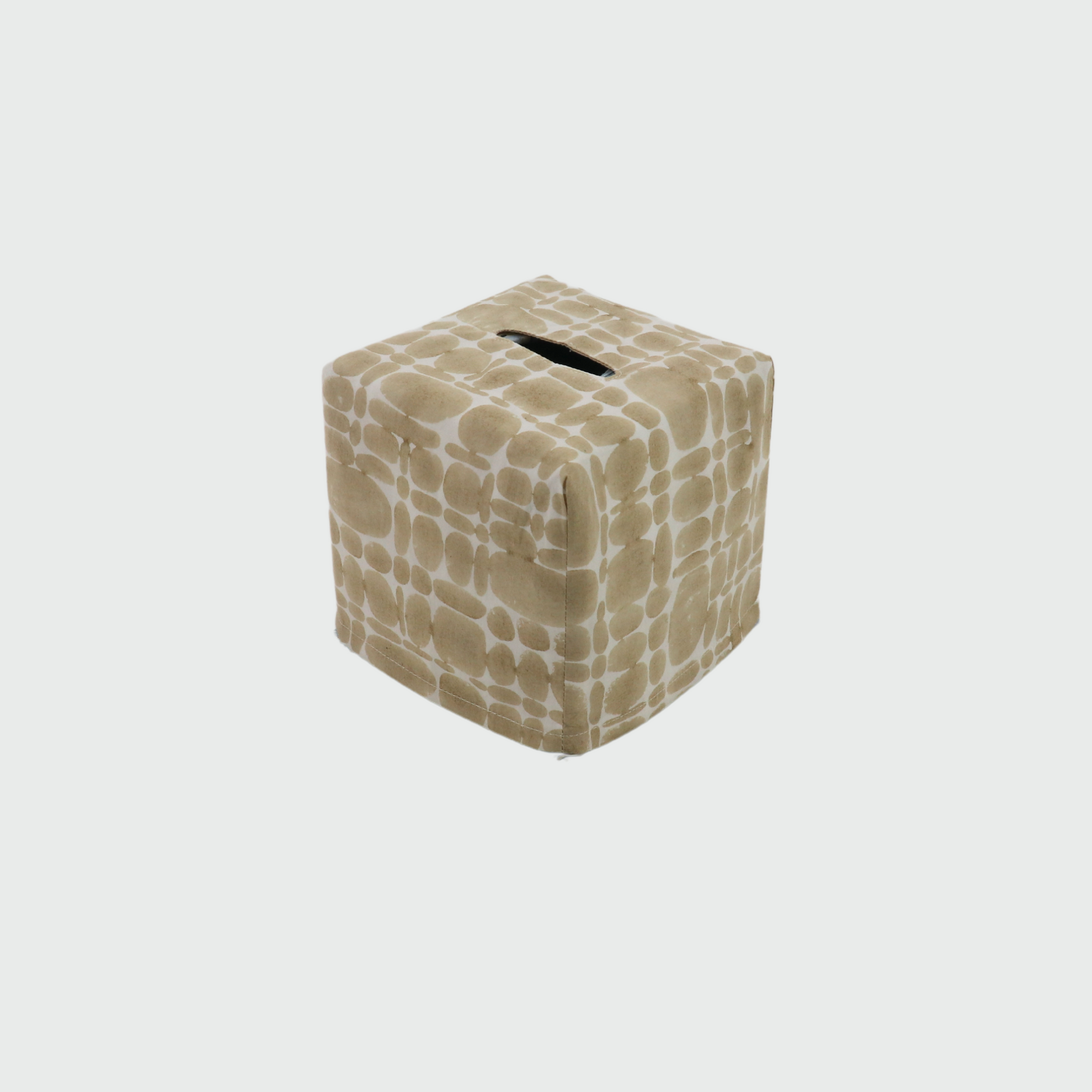 Nos housses de boîtes à mouchoirs sont soigneusement fabriquées à partir des restes de tissu de notre collection de literie. Cet imprimé galets moderne en beige ajoute une touche subtile et élégante à n'importe quelle pièce.